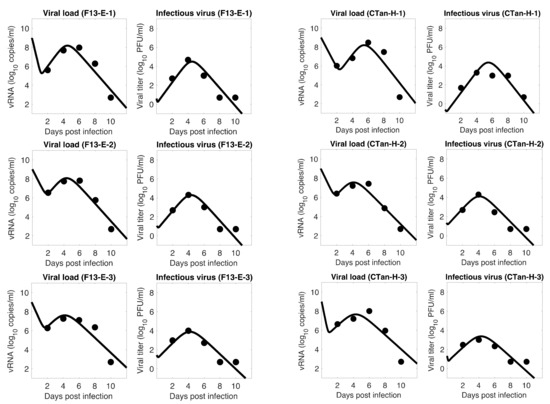 The data used in this study were obtained from digitizing a published experimental infection of ferrets by SARS-CoV-2 [1]. As mentioned above, two different SARS-CoV-2 viruses were considered: F13-E (isolated from an environmental sample) and CTan-H (isolated from a human patient). Six ferrets (three animals in each group) were inoculated intranasally with plaque-forming unit (PFU) of F13-E virus (animal: F13-E-1, F13-E-2, and F13-E-3) and CTan-H virus (animal: CTan-H-1, CTan-H-2, and CTan-H-3) in a volume of 1 mL. Viral RNA copies and viral titer (infectious virus) were recorded in nasal washes collected on days 2, 4, 6, 8, and 10 post infection (p.i.) from each animal. For our modeling, the data lying below the lower limit of detection (i.e., 3 viral RNA copies per mL and 1 PFU per mL) were taken as half of the limit of detection.