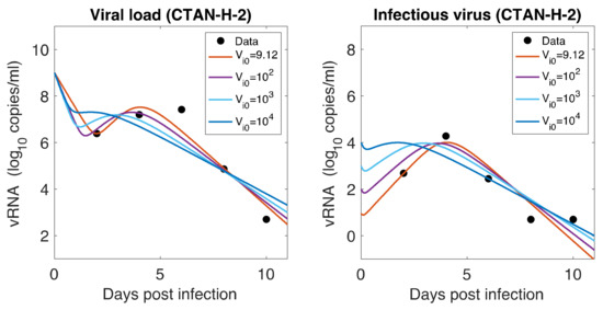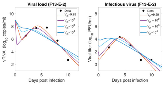 As mentioned earlier, animals were inoculated intranasally with ~ PFU in a volume of 1 mL, but our estimates showed a relatively low level of initial infectious virus at the infection site (8.18 PFU/mL for F-13E group and 2.46 PFU/mL for CTan-H group). To understand this discrepancy, we performed further data fitting by fixing the initial infectious virus population at the infection site (upper respiratory tract) at PFU/mL (Figure 5). We found that a low level of initial infectious virus is needed to obtain reasonable fits to the data (F-13E-2: SSR = 3.21, 3.99, 7.65, 10.65, AIC = 28.64, 30.80, 37.32, 40.63, for PFU/mL, respectively; CTan-H-2: SSR = 2.99, 3.64, 5.79, 8.21, AIC = 27.92, 29.89, 34.53, 38.03, for PFU/mL, respectively). There may be a number of factors that have contributed to this discrepancy. The viral stocks used for inoculation were prepared in Vero E6 cells and the measurement of their infectiousness was done by plaque assay using Vero E6 cells [1]. Vero E6 cells are a stable cell line derived from African green monkey kidney cells. The cells have lost the ability to secrete IFN due to spontaneous gene deletions [60,61], indicating Vero cells should be more susceptible to infection than the target cells in the ferret. Thus, PFUs measured in Vero cells may be considerably greater than the corresponding infectivity in ferrets. Additionally, the infectiousness at the infection site within ferrets may be different from the one estimated in in-vitro experiments, as the virus may adapt to the in-vivo cell environment [62]. Lastly, we note that the infection of SARS-CoV-2 has been successfully established in ferrets with widely varying initial infectious doses and the infection has been reported to depend on the route of transmission [63,64].