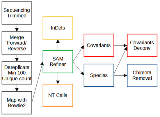Figure 1 illustrates the steps of our workflow. The two steps following read trimming used the VSEARCH tool [16]. First, the trimmed paired reads were merged using vsearch ‘--fastq_merge’ with default parameters. Merged reads were then dereplicated using vsearch ‘--derep_fulllength’ with the arguments ‘--minsize 100’ and ‘--sizeout’. These arguments limit the output to unique sequences that occur at least 100 times and appends the sequence IDs with ‘size=#’, where # is the number of times that particular sequence occurred in the reads. The cutoff of 100 counts removes late-stage PCR errors, leaving only sequences representing the original templates or errors that occurred in early cycles of the PCR. This removal makes further analysis simpler and faster. However, very low frequency original template sequences will also be removed by this cutoff, so this step could be skipped to preserve such rare sequences. The resulting unique sequences were mapped to the sequence of SARS-CoV-2 (NCBI Reference Sequence: NC_045512.2, https://www.ncbi.nlm.nih.gov/nuccore/NC_045512, accessed on 7 February 2021) spike ORF using Bowtie2 [17] with default parameters to generate standard SAM formatted files. Having SAM formatted files allows the use of the program we developed for amplicon sequencing results. All files associated with these steps for our analysis of the Fenton, MO sewershed in this manuscript can be accessed at https://github.com/degregory/SR_manuscript/tree/master/Fenton_Data accessed on 23 June 2021.
