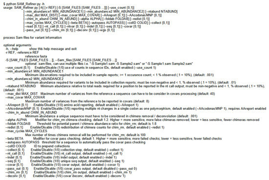 Our program, SAM Refiner, is currently a command line-based python script and is available at https://github.com/degregory/SAM_Refiner accessed on 23 June 2021 along with updated documentation. In order to run SAM Refiner, a python compiler or interpreter is needed (https://docs.python.org/3/tutorial/interpreter.html accessed on 23 June 2021). Though only tested in a Linux environment, it should function with other common operating systems. Figure 2 shows the command line usage for SAM Refiner. Standard SAM formatted files are the starting point for our program. These files are generated by many mapping programs, including Bowtie2 [17] and BWA [18]. The default functions of SAM Refiner follow. Files with the extension .sam (case insensitive) in the working directory will be identified and processed. To process SAM files, SAM Refiner must be provided a FASTA formatted file for a reference sequence using the command line argument ‘–r reference.fasta’, where the FASTA file contains the same sequence ID and sequence used to map the sequencing reads in the SAM formatted file. If the IDs of the given reference and the reference of mapped sequences in the SAM file do not match, those sequences will be ignored. If the SAM formatted files were generated from dereplicated or collapsed sequences that contain the unique read count in sequence ids where the count is at the end of the id and denoted with a ‘=’ or ‘−’, SAM Refiner will recognize the counts, i.e., ‘Seq1:1;counts = 20′ will be recognized as a sequence with 20 occurrences.