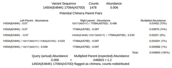 Using the SAM files generated from the sequencing data of the Fenton sewershed, we ran SAM Refiner with the same reference as was used for Bowtie2 mapping, the SARS-CoV-2 (NCBI Reference Sequence: NC_045512.2) spike ORF sequence. The resulting outputs can be accessed at https://github.com/degregory/SR_manuscript/tree/master/Fenton_Data accessed on 23 June 2021. These outputs allow us to see the variant lineages present at different dates in this sewer shed. However, as can be seen in Supplementary 1, many of the sequences reported appear to be chimeric sequences arising from template jumping. While these outputs can still be used for further analysis, removing chimeric sequences makes such analysis easier, so SAM Refiner also has methods to remove such chimeric sequences.
