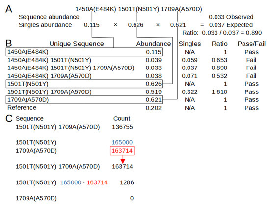 Second Chimera Removal Method in SAM Refiner, Covariant Deconvolution. (A) Calculations of the singles/expected abundance and abundance ratio for one of the unique sequences from Sup. 5 and the abundances from Sup. 7. Lines connect the singles and their abundance to the same in (B). (B) Calculations for determining if a unique sequence passes the initial check. Sequences pass when they have an abundance/singles ratio of 1 or greater. (C) Passed sequences are processed in order of greatest ratio to least. Counts of the sequence are set to the counts of the least abundant single variant, and that count is then removed from all single variants in that sequence.