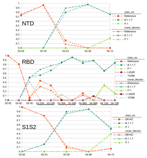 We used the chimera removed and covariant deconvolution outputs to assign sequences to known variant lineages or the reference (Supplementary 10, 11 and 12) based on polymorphisms present. Polymorphisms were considered for lineage assignment if they appeared in multiple sequencing runs or were known to be present in circulating populations reported to GSIAD (https://www.gisaid.org/, accessed on 20 February 2021). Polymorphisms that could not be validated were not taken into account for lineage assignment. Based on these assignments, we were able to observe the changes to virus populations in the sewershed over time (Figure 5). We classified the sequences found from the NTD amplicon as matching reference sequence, lineage B.1.1.7 (Alpha) with ‘203-208Del 429-431Del’ or lineage P.1 (Gamma) with ‘412T(D138Y) 570T(R190S)’ (Supplementary 10). Sequences from the RBD amplicon matched reference sequence, lineages B.1.1.7 with ‘1501T(N501Y) 1709A(A570D)’, P.1 with ‘1250C(K417T) 1450A(E484K) 1501T(N501Y)’, or had the single variations of T478K or L452R (Supplementary 11). T478K and L452R each have lineage associations. However, no other polymorphisms are associated with these in the RBD amplicons, nor were any polymorphisms present in the other amplicons that would indicate the presence of any associated lineages. While these SNPs could be the result of PCR error, it is more likely the associated lineages exist in the sewershed, but, due to stochastic effects, the other associated polymorphisms in the other amplicons were not detected. They could have also arisen in a reference background. As we cannot assign them to a known lineage with any certainty, we assigned them to their own category. Sequences from the S1S2 amplicon matched lineage B.1.1.7 with ‘1841G(D614G) 2042A(P681H) 2147T(T716I)’, lineage P.1 with ‘1841G(D614G) 1963T(H655Y) 2063T(A688V)’ or the B.1 lineage with only the now ubiquitous D614G variation (Supplementary 12). The 03-23 S1S2 sample had a sequence ‘1841G(D614G) 2037G(N679K) 2063T(A688V)’. While A688V is associated with P.1, it does not appear in that context here. As that is the only sample where those covariant sequences were observed and the polymorphisms are not frequently reported in GISAID (outside of P.1 for A688V), we did not feel we could validate this sequence as a novel lineage and instead tentatively assigned it to the reference category. From these results, we can conclude that the SARS-CoV-2 population of this sewershed changed in March 2021 from almost exclusively the D614G B.1 lineage to mainly the B.1.1.7 lineage, with the introduction of P.1 early in April 2021. This general method is now being used to track SARS-CoV-2 variants in many Missouri sewersheds (https://storymaps.arcgis.com/stories/f7f5492486114da6b5d6fdc07f81aacf accessed on 23 June 2021).