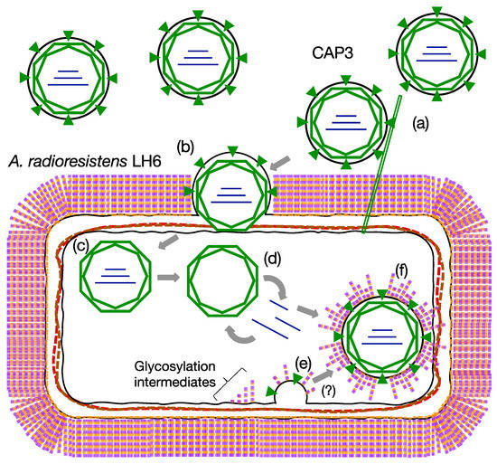 Proposed schematic life cycle of A. radioresistens infecting cystovirus CAP3. (a) CAP3 binds to the protruding pilus. (b) CAP3 fuses with the host outer membrane, degrading host peptidoglycan with its muramidase. (c) CAP3 capsid enters the cytoplasm. (d) dsRNA segments are polymerized out of the capsids as +ssRNA (prior to entry into a new capsid for dsRNA synthesis) and viral replication takes place. (e) The cell inner membrane, the site of most bacterial glycoconjugate biosynthetic assemblies, is used to envelop virion particles. (f) Mature virion particles are constructed, potentially with intermediates of host glycosylation embedded in the membrane, ready to lyse the cell and be released.