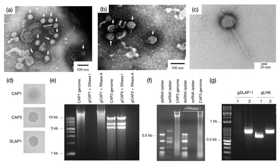 Characterization of LH6-infecting phages. Transmission electron micrographs of (a) CAP1, (b) CAP3 and (c) SLAP1. (d) Plaque morphology of isolated phages. (e) CAP1 and CAP3 genome before and after treatment with DNase I or RNase A. (f) CAP3 genome is not degraded with RNase If. (g) PCR analysis of SLAP1 and LH6 gDNA using capsid primers from prophage 1 (lanes 1) and prophage 2 (lanes 2) in the LH6 genome [6].