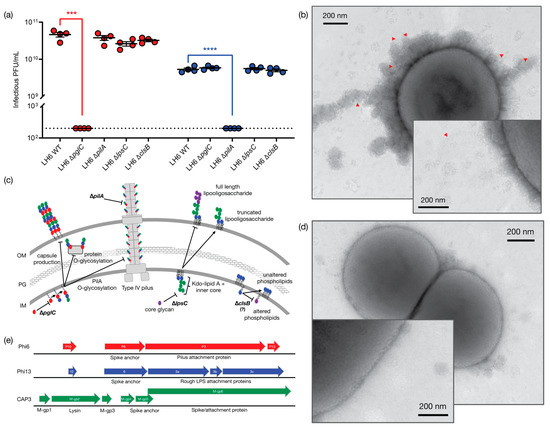 Determination of host binding receptor for CAP1 and CAP3. (a) Determination of plaquing efficiency for CAP1 (red circles) and CAP3 (blue circles). Significance was calculated using unpaired t-tests. *** p ≤ 0.001; **** p ≤ 0.0001 (b) Transmission electron micrograph of LH6 WT showing CAP3 attachment to pili (indicated by red arrows). Inset: enlargement of single pilus. (c) Schematic of effects on LH6 structures when pglC, pilA, lpsC and clsB genes are deleted. (d) Transmission electron micrograph of LH6 ∆pilA showing a lack of pili and reduced CAP3 association. Inset: enlargement of cell surface showing no observable pili. (e) Syntenic comparisons of M genomic RNA segments from Phi6, Phi13 and CAP3 showing differences and similarities in attachment proteins. Genes are drawn to scale and correspond to Figure S3 (S and L segments are shown in Figures S2 and S4, respectively).