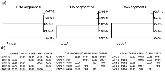 Genomic sequence comparison of CAP3–CAP7 phages. (a) Molecular phylogenetic analysis was determined by the Maximum Likelihood method. Each segment (S, M, L) was compared independently, and the trees with the highest likelihood are shown. Trees are drawn to scale, with branch lengths measured in the number of substitutions per site, and bootstrap values are indicated at the appropriate branch points. (b) Percent similarity matrices compare each RNA segment (S, M, L) to the other CAP phage RNA segments.
