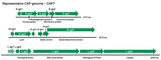 After genome and TEM characterization of the CAP1–7 and SLAP1 phages, we propose that CAP1 and CAP2 belong to the Podoviridae. The DNA content, icosahedral heads and short tails are consistent with other members of this phage family [30]. Second, we propose that SLAP1 belongs to the Siphoviridae due to the icosahedral head and long flexible tail, which is the hallmark of this phage family [31]. Finally, we propose that CAP3–CAP7 belong to a new phage genus within the family Cystoviridae. The enveloped capsid, along with the segmented dsRNA genome are indicative of this family, along with the sequencing identity, which shares synteny and some homology with other cystoviruses infecting members of the Pseudomonas genus (Figure 6 and Figures S2–S4) [32,33]. Interestingly, these are the first cystovirus phages that infect any species besides the seven characterized phages that infect P. syringae and P. aeruginosa [17]. Whole genome sequencing and subsequent analysis showed that some of the CAP genes could be assigned putative functions based on synteny to the other cystoviruses (Table 1, Figure 3). The lack of distinct synteny shows that these viruses mutate at a high rate and can undergo genomic rearrangement, while maintaining a similar genome size and life cycle. Better understanding of these processes could give insight into the evolutionary tendencies of RNA viruses as whole.