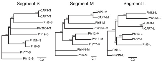 RNA segment comparison between CAP3, CAP7 and the previously sequenced Pseudomonas-infecting cystoviruses. Trees are drawn to scale, with branch lengths measured in the number of substitutions per site, and bootstrap values are indicated at the appropriate branch points.