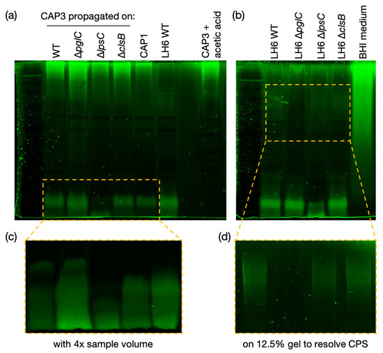 Pro-Q™ Emerald 300 staining of CAP3 glycans. (a) Proteinase K digests of CAP3 propagated on LH6 WT, ∆pglC, ∆lpsC and ∆clsB, and CAP1 phages were separated on a 15% SDS-PAGE gel and stained with Pro-Q™ Emerald 300 glycan staining kit (compare with Figure S5). CAP3 was treated with 1% acetic acid to test whether the low molecular weight glycan is a lipid-linked glycoconjugate (and Figure S6). (b) Proteinase K digests of LH6 WT, ∆pglC, ∆lpsC and ∆clsB were separated on a 15% SDS-PAGE gel and stained to show differences in glycosylation. BHI medium was also tested to determine the origin of the high molecular weight glycan in the phage samples. (c) CAP3 propagated on LH6 WT, ∆pglC, ∆lpsC and ∆clsB, and CAP1 phages were loaded with 4x volume (from Figure S6). (d) Proteinase K digests of LH6 WT, ∆pglC, ∆lpsC and ∆clsB were separated on a 12.5% SDS-PAGE gel to better resolve high molecular weight capsular polysaccharides (from Figure S7).