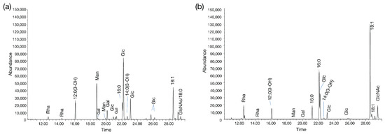 2.11. Glycosyl and Fatty Acid Composition Analysis of CAP3 and LH6 by Gas Chromatography-Mass Spectrometry (GC-MS)