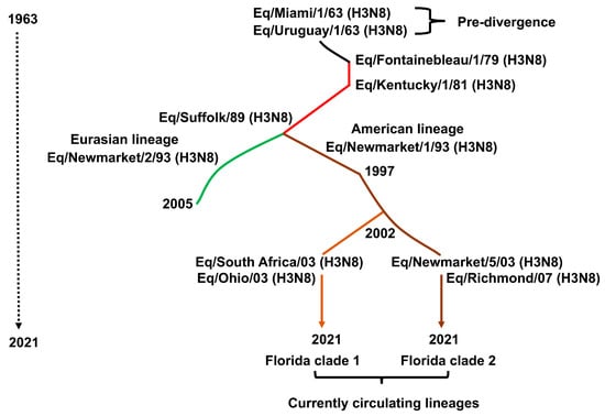- Favaro, P.F.; Fernandes, W.R.; Reischak, D.; Brandao, P.E.; Silva, S.O.S.; Richtzenhain, L.J. Evolution of equine influenza viruses (H3N8) during a Brazilian outbreak, 2015. Braz. J. Microbiol. 2018, 49, 336–346. [Google Scholar] [CrossRef]
