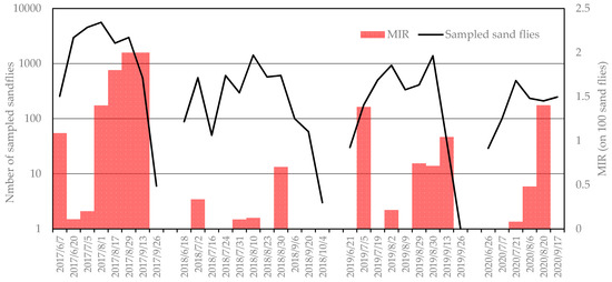The MIRs of Leishmania recorded in different seasons are shown in Figure 1. The 2017 season, which was characterized by a great abundance of sand flies, showed more intense Leishmania circulation (Figure 1), and the proportion of Leishmania-positive pools in 2017 differed significantly from the proportion in the other years (42/110 in 2017 vs. 37/255 in 2018–2020, Pearson χ2, p < 0.001).