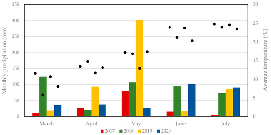 Monthly precipitation (histograms) and average temperature (black circles) from March to July at the sampled sites during the period of surveillance.
