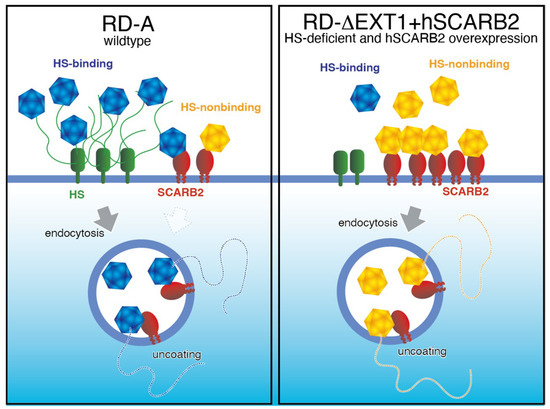 - Kobayashi, K.; Mizuta, K.; Koike, S. Heparan sulfate attachment receptor is a major selection factor for attenuated enterovirus 71 mutants during cell culture adaptation. PLoS Pathog. 2020, 16, e1008428. [Google Scholar] [CrossRef] [PubMed]