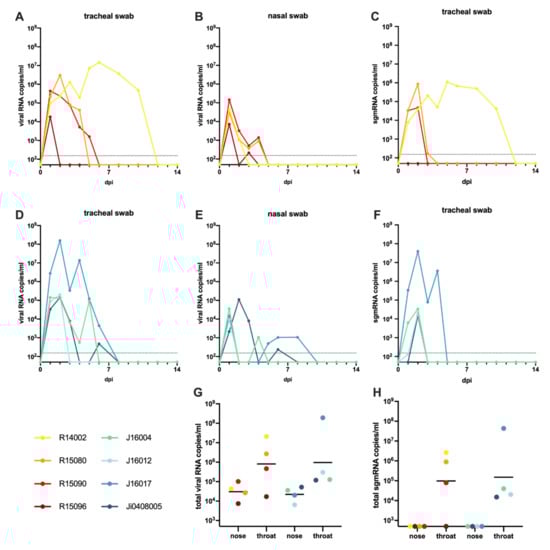 The analysis of viral subgenomic messenger RNA (sgmRNA), which is considered to better reflect actual virus replication [36], confirmed infection in 7 out of 8 macaques. Only rhesus macaque R15096, which already displayed relatively low levels of viral RNA (Figure 1A,B) was negative for sgmRNA in both throat and nose swabs at all time points. In the remaining animals, sgmRNA levels were exclusively detected in the tracheal swabs, while no evidence of replication was found in the nasal swab samples (Figure 1C,F,H, Supplementary Table S3B).