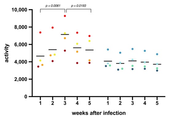 3.2. Body Temperature, Activity, Clinical Symptoms, and Blood Parameters after SARS-CoV-2 Infection