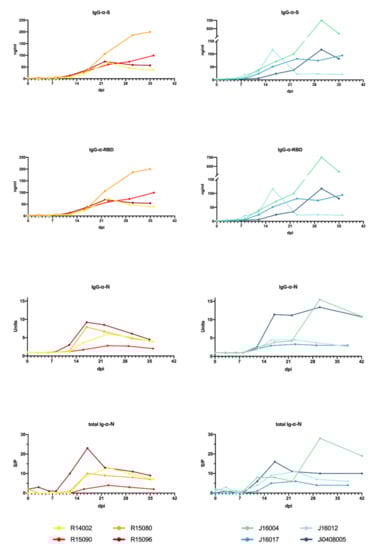 In addition to the immunoglobulin responses to the spike protein, antibody responses to the nucleoprotein (N) were measured. Total immunoglobulin (Ig) in sera was determined by DR-ELISA. Ig responses became evident between day 10 and 12 pi. For both rhesus as well as cynomolgus macaques, a peak in levels was measured between 12 and 23 days pi, except in Ji0408005, where the peak was at day 30 pi.