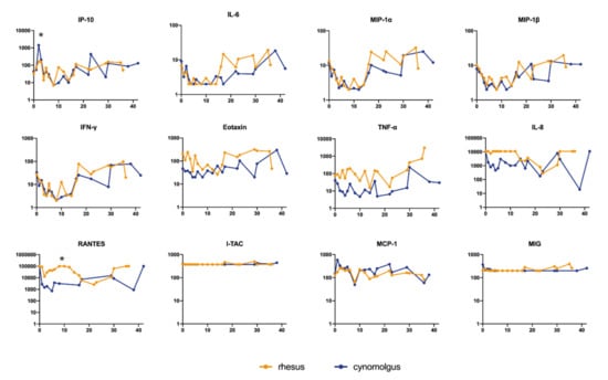Cytokine and chemokine levels in peripheral blood after SARS-CoV-2 infection. Longitudinal sera collected after SARS-CoV-2 infection were tested. Results were expressed as pg/mL. Statistically significant differences in the geometric mean between rhesus and cynomolgus macaques are indicated with *.