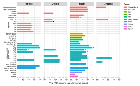 Viral RNA loads in tissues of SARS-CoV-2-infected rhesus macaques (R14002) and cynomolgus macaques (J16012, J16017, and Ji408005). Viral RNA was quantified by qRT-PCR and calculated per gram of tissue. Only animals with viral RNA-positive tissues are shown. On the y-axis, the tissues are listed, on the x-axis the RNA copies per g tissue. Tissues in which no RNA was observed in any of the animals are not shown. The tissues are grouped by color codes as indicated on the right. Tissues that tested positive for sgmRNA are indicated with *. Abbreviations: L, left; R, right; LN, lymph node; UR, upper right lung lobe; AR, accessory right lung lobe; MR, middle right lung lobe; LR, lower right lung lobe; UL, upper left lung lobe; ML, middle left lung lobe; LL, lower left lung lobe.