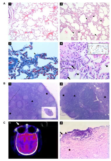 Histopathology of tissues from rhesus and cynomolgus macaques infected with SARS-CoV-2 and euthanized 36 to 42 days post-infection. (A) Panel 1. Lung of healthy, uninfected macaque (Hematoxylin and Eosin (HE) staining, original magnification 100×); Panel 2. Lung of rhesus macaque infected with SARS-CoV-2 and euthanized day 36 pi. Focal area with mild alveolar septa expansion with a low number of mononuclear inflammatory cells (asterisks) and foci of bronchiolar smooth muscle hyperplasia (arrows) (HE, 100×); Panel 3. Masson’s trichrome staining shows the presence of collagen (lighter blue) mildly expanding the alveolar septa at some areas indicated by arrows. The internal control is the blood vessel on the left side with lighter blue staining of tunica adventitia (Trichrome stain, 630×); Panel 4. Lung of infected rhesus macaque with foci of mildly thickened alveolar walls lined by cuboidal to columnar epithelial cells with hyperchromatic nuclei representing type II pneumocyte hyperplasia (arrows) and few aggregates of macrophages in the alveolar lumina (asterisks) (HE, 400×). Panel 4 inset: TTF1 marker was used to identify and confirm type II pneumocytes, stained in red-brown (IHC, 400×). (B) Panel 1. Cervical lymph node of cynomolgus macaque J16017 with marked follicular lymphoid hyperplasia. Numerous lymphoid follicles in the cortex (square), paracortex (arrowhead), and medulla (asterisk) are indicated (HE, 50×); Panel 2. Mesenteric lymph node of rhesus macaque R14002 with marked paracortical lymphoid hyperplasia and medullar sinusoidal histiocytosis. Cortex (square), paracortex (arrowhead), and medulla (asterisk) are indicated (HE, 50×). (C) Panel 1. PET-CT image of the skull of J16017 with prominent metabolic activity in the left ocular region (arrow); Panel 2. Conjunctiva of the same individual. Numerous perivascular and multifocal lymphocytes infiltrating the stratified squamous epithelium and the substantia propria. Goblet cell (arrow), non-keratinized stratified squamous epithelium (arrowhead), and substantia propria (asterisk) are indicated (HE, 200×).