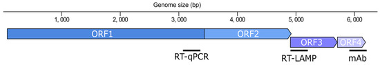 Genome organization of ToBRFV and regions targeted by the different tests (RT-qPCR, RT-LAMP, and ELISA). RT-qPCR was directed to the 3′ end of the large fragment of the RdRP (ORF1), RT-LAMP to the start of the MP (ORF3), and ELISA against the C-terminus of the CP, which is the gene product of ORF4.