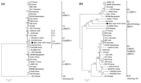 The phylogenetic trees based on the nucleotide sequences of the polyprotein in Segment A showed that Serotype I strain contained four previously described genogroups: A1 (cIBDV), A2 (VarIBDV), A3 (vvIBDV), and A8 (aIBDV) [8]. Genogroup A2 included lineages A2a/b/c (early variant IBDV) and A2d (nVarIBDV) [8,18]. The IBDV-JS19-14701 strain was clustered with SHG19 [16], which is a representative strain of nVarIBDV (A2d) (Figure 1a). Based on the nucleotide sequences of VP1 in Segment B, the Serotype I representative strains were divided into three genogroups, B1, B2, and B3, and IBDV-JS19-14701 belonged to the Genogroup B3 (HLJ0504-like strains) but not Genogroup B1 (including SHG19-like strain) (Figure 1b). In addition, the phylogenetic trees based on HVR of VP2 and B-marker of VP1 also showed that the IBDV-JS19-14701 strain contained nVarIBDV Segment A (Genogroup A2d) and HLJ0504-like Segment B (Genogroup B3) (Figure S1).