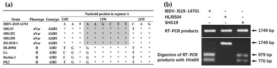 Identification of co-infection by restriction enzyme digestion analysis. (a) A part of the nucleotide alignment report showing the presence or absence of the Hind III restriction enzyme site (bp 2188–bp 2193) in Segment A. An asterisk indicates a residue identical to the IBDV-JS19-14701 strain. The shaded area indicates the presence of a Hind III restriction site; (b) total RNA of IBDV-JS19-14701, SHG19, or HLJ0504 was extracted and subjected to RT-PCR, respectively. The RT-PCR products (bp 1421–bp 3170 of Segment A, 1749 bp) were then subjected to Hind III digestion.