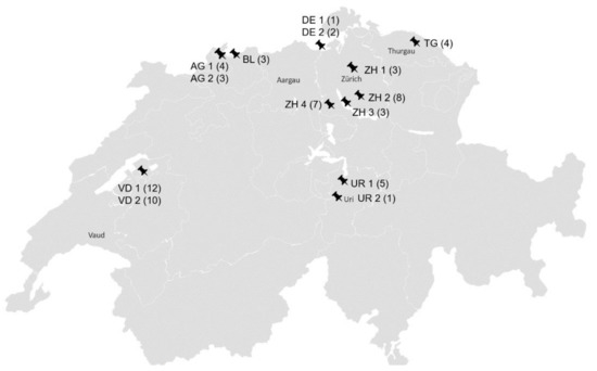 Geographical distribution of the stables; AG: Aargau; BL: Baselland; DE: Germany; TG: Thurgau; UR: Uri; VD: Waadt; ZH: Zurich; ZH 1 (3): canton, stable number, number of sampled horses per stable.