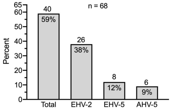 eGHV were detected in 40 out of 68 samples (59%); 26 (38%) of these were positive for EHV-2, 8 (12%) for EHV-5 and 6 (9%) for AHV-5 (Figure 3).