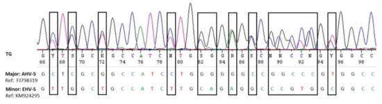 Visualization of the superimposed electropherograms of AHV-5 (major sequence) and EHV-5 (minor sequence) in sample LS030-2 (Table 1).