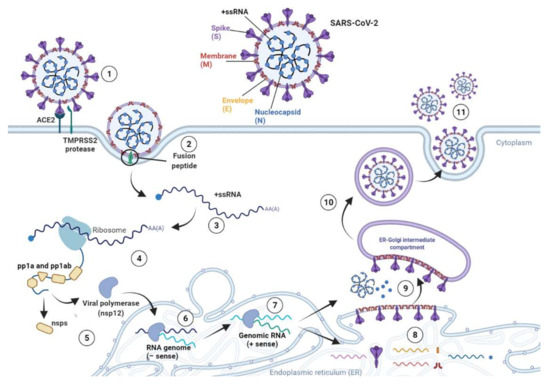 SARS-CoV-2 life cycle. (1) Binding between S glycoprotein and ACE2 receptor on the surface of host cell. (2) The fusion peptide undergoes conformational changes allowing SARS-CoV-2 fusion and entry into the cell cytoplasm. (3) Release of SARS-CoV-2 single-stranded positive RNA genome. (4) Viral genome is immediately transcribed by host cell ribosomes. (5) The translated RNA encodes polyproteins (pp1a and pp1ab) and the viral RNA-dependent RNA polymerase NSP12. (6) NSP12 produces full-length negative-sense copies of SARS-CoV-2 RNA. (7) The negative-sense RNA genome is employed as a template for generating the new positive-sense genomes. (8) The translation of the viral RNA occurs in the endoplasmic reticulum of host cells and leads to the synthesis of structural proteins. (9) Structural proteins move into the Golgi intermediate compartment where viral assembly occurs. (10) The mature viral progeny germinates from the intermediate compartment of the Golgi, and it is released as secretory vesicles. (11) SARS-CoV-2 virions are secreted by exocytosis.