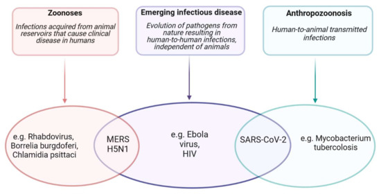 COVID-19 could be considered an emerging infectious disease of probable animal origin caused by the spillover mechanism. Spillover is the natural animal–new host transmission of a pathogen. Infection in the new host may result in a dead end (in the final hosts) or may lead to anthropozoonotic transmission or spread through secondary epidemiological cycles [129]. Considering the animal origin, there are two hypotheses for the emergence of SARS-CoV-2: a natural selection of the virus in an animal host before jumping to humans or a natural selection of the virus in humans after zoonotic transmission [120,129]. Figure 3 explains an example of zoonoses, anthropozoonoses, and emerging infectious diseases, defining SARS-CoV-2 as an emerging infectious disease of animal origin characterized by the features of anthropozoonoses (human-to-animal infection).