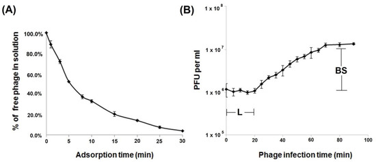 2.5. Phage Adsorption and One-Step Growth Experiments