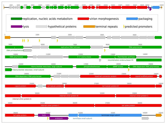 - Popova, A.V.; Shneider, M.M.; Mikhailova, Y.V.; Shelenkov, A.A.; Shagin, D.A.; Edelstein, M.V.; Kozlov, R.S. Complete Genome Sequence of Acinetobacter baumannii Phage BS46. Microbiol. Resour. Announc. 2020, 9, e00398-20. [Google Scholar] [CrossRef]