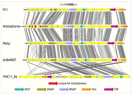 The intergenomic comparison of four phylogenetically close A. baumannii phages, namely Aristophanes, Fri1, Petty, and Acibel007 (belonging to the subfamily Beijerinckvirinae of the family Autographiviridae), and Pseudomonas phage YMC11/06/C171_PPU_BP (belonging to the subfamily Corkvirinae of the family Autographiviridae) indicates both the overall similarity of the Autographiviridae phage genomes and the more prominent similarity of the Beijerinckvirinae phage genomes. The differences are located mainly in the early-genes region (Figure 4) encoding products which are most likely involved in inhibiting or redirecting of functionally important host systems [40]. The Beijerinckvirinae tailspike proteins (except for the N-termini of the proteins) demonstrate a significant difference in primary structure. The Aristophanes genome contains totally 12 genes unique for this phage (Table S1).