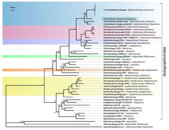 In this paper, we investigate phage Aristophanes isolated on the bacterial lawn of A. baumannii strain with a K26 CPS structure. This phage was shown to be rather unique among all previously described A. baumannii viruses that have been combined into the new family Autographiviridae created in 2019 [43]. According to the results of the genomic and phylogenetic analysis, the phage belongs to the subfamily Beijerinckvirinae comprising the Acinetobacter phages of the genera Friunavirus, Pettyvirus, and Daemvirus. However, while sharing the common features of the above phage genera (e.g., the genomic structure and homologous proteins), phage Aristophanes substantially differs from other Beijerinckvirinae phages in the overall nucleotide similarity. About a quarter of the Aristophanes predicted proteins can be considered as unique ones. These differences in nucleotide composition together with the phylogenetic analysis of the large subunit of terminase suggest the assignment of the phage to a new separate genus of the subfamily Beijerinckvirinae of the family Autographiviridae.