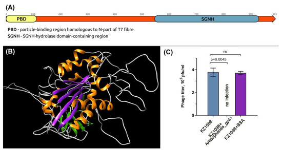 (A) Schematic representation of the Acinetobacter phage Aristophanes tailspike protein obtained with BLAST search and HMM analysis. (B) 3D structure homology modelling of the SGNH-hydrolase domain-containing region of the Acinetobacter phage Aristophanes tailspike protein obtained with HHpred. Five parallel β-sheets intrinsic for all SGNH-hydrolases are colored purple, other β-sheets are colored green and the α-helices are colored orange. The model is made using the PDB structure 4K7J of peptidoglycan O-acetylesterase belonging to SGNH-family. (C) Phage Aristophanes infection inhibition by Aristophanes_gp41. From left to right, phage titers observed on the bacterial lawns after the treatment of A. baumannii KZ1098 cells with phage Aristophanes only, after cell cultures preincubated with purified Aristophanes_gp41, and BSA (as a negative control), followed by phage Aristophanes treatment. P: p-value, ns: not significant.