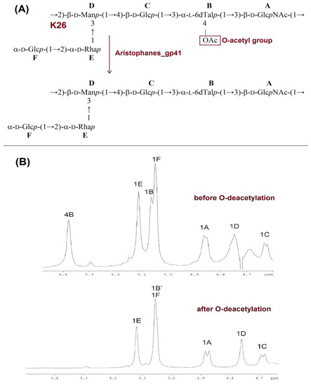 Treatment of the K26 CPS with Aristophanes_gp41 caused no changes to the NMR spectral data of the constituent sugar residues except for 6-deoxytalose (6dTal) (unit B). An unusual low-field position of the H-4 signal of 6dTal at δH 5.38 was observed in the CPS and accounted for by 4-O-acetylation of this sugar residue. Treatment with the phage tailspike protein caused an upfield shift of this signal to δH 3.93 (Figure 7B). This displacement was evidently due to elimination of a deshielding effect of an O-acetyl group that was, therefore, located at position 4 of unit B in the initial CPS (Figure 7B). Otherwise, the 1H and 13C NMR spectra of the CPS before and after O-deacetylation did not differ essentially, and hence, O-deacetylation caused no other structural changes.