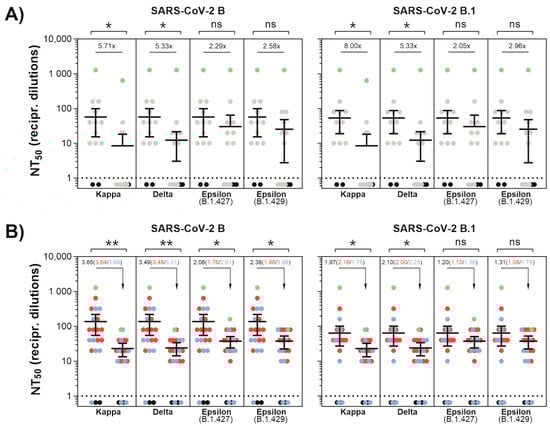 Convalescent sera showed reduced neutralization of Kappa and Delta by a factor of 8.00 and 5.33, respectively, relative to B.1 (Figure 1A). For the Epsilon lineages, B.1.427 and B.1.429 harboring D614G and L452R, the reduction in neutralization efficiency by convalescent sera of both variants was less severe with only 2.05 and 2.96, respectively. The serum from an immunocompromised patient which was long-term PCR positive for SARS-CoV-2 neutralized Kappa less efficiently compared to Delta and the Epsilon lineages.