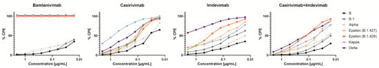 Neutralization efficacy of monoclonal antibodies against SARS-CoV-2 variants. Serially diluted (1:2) monoclonal antibodies (mAbs) were incubated with the indicated SARS-CoV-2 variants. Cytopathic effect (CPE) formation was analyzed after 72 h. Average values of 16 biological replicates (except n = 8 for bamlanivimab) are depicted. Using A549-AT cells, CPE formation was microscopically evaluated. Physiological concentrations of mAbs were applied according to the manufacturer’s instructions.