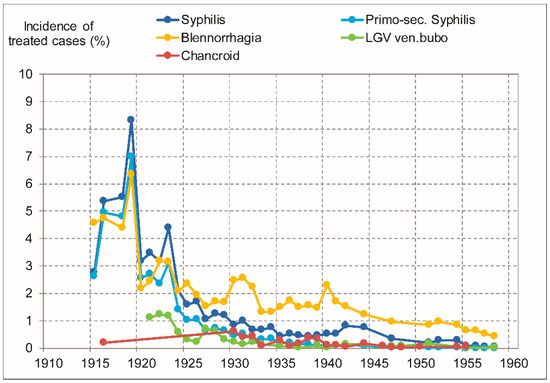 For the province as a whole, we could obtain data for Europeans spanning the period 1915–1958 and we observed that incidence rates, by the late 1950s, had dropped one (chancroid and discharge) or two (syphilis and LGV) orders of magnitude (Figure 2). The proportion of syphilis detected in primary or secondary stages declined strongly, as predicted by syphilis epidemiological models [69]. These patterns are similar to those found for Leopoldville’s African population. Briefly, and as we published elsewhere [6,40], the incidence of treated cases of ulcerative stages of GUD in Africans declined by two orders of magnitude between 1919–1935 and the late 1950s, as STD treatment campaigns were implemented, and sulfonamides and antibiotics were adopted.