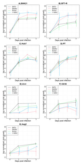 Viral growth experiments were performed in 24-well plates. With 1 × 105 cells per well, BHK-21, HuH7, PT and SFT-R cells were first incubated in a 50-mL tube as a suspension with an MOI of 0.1 for 60 min at 37 °C with 5% CO2. Cells were centrifuged at 500× g for 5 min, washed with 1× PBS (three times) and finally resuspended in ready-to-use DMEM with FBS concentration reduced to 5% and seeded in a 24-well plate. Growth kinetics in U4.4, C6/36 and Aag2 cells were performed with 1 × 106 cells/well at an MOI of 0.1. Incubation was at room temperature for 60 min. Afterwards, cells were washed with 1× PBS and resuspended with ready-to-use Schneiders’ Drosophila Medium before seeding. Incubation was at 25 °C, and at different time points, the supernatant was stored from one well for each experiment (0, 24, 48 and 72 h post-infection, 48 h p.i only for mammalian cells).