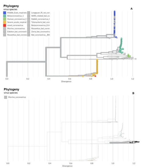 Phylogeny of coronaviruses including the novel coronavirus SARS-CoV-2. (A) Phylogeny of coronaviruses including the novel coronavirus SARS-CoV-2.; (B) Phylogeny of murine coronaviruses including the murine hepatitis virus.