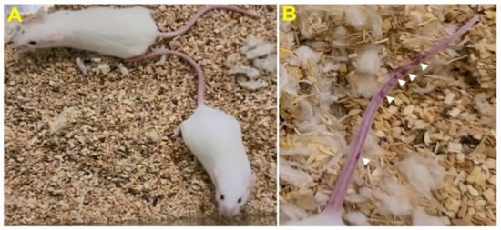 Stage I symptoms (drowsy and lack of movement) on day 2 and stage II symptoms (slightly ruffled fur and altered hind limb posture) on day 3 were observed post-MHV-1 inoculation. Stage III symptoms (ruffled fur and mildly labored breathing) were detected on days 4 and 5. Stage IV (ruffled fur, inactivity, moderately labored breathing, and tremor) was observed on day 6, and stages V and VI (ruffled fur, obvious labored breathing and lethargy, as well as a moribund state and death) were noted from days 7 to 12 (Figure 2B). Figure 2A,B involves the same animals. For example, in Figure 2A, approximately 40% of animals showed clinical signs of infection and all of them were in stage I. On day 3, about 55–60% animals showed clinical signs of infection that were of stage II. The additional mice (10–20%) that exhibited clinical signs of infection at later stages showed a severity similar to that of mice that exhibited clinical signs of infection at early stages. Of note, we observed mild diarrhea (several loose stools in one day) in the early stages of illness (from 2 to 4 days). However, the diarrhea ended from days 5 to 12 and occurred only in a few animals (5/16 mice), as observed in humans in association with COVID-19 [,]. Further, MHV-1 inoculated mice displayed severe venous thrombosis (4/16 mice at days 5–7), a characteristic feature of COVID-19 (Figure 3) [,,,,,,,,,]. Milder forms of thrombosis were also observed in MHV-1 inoculated mice at days 5–7 (7/16). The natural history of the disease was observed in mice that survived after day 12 for up to 91 days.