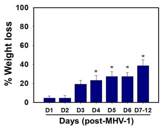 Body weight losses in MHV-1 infected mice. MHV-1 inoculated mice lost 20–40% of body weight over days 3–8, corresponding well with the severity of the disease (n = 16). * p < 0.05 versus control.