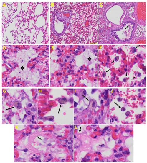 Lung from MHV-1 exposed mice. (A) Normal mouse. (B) MHV-1-infected mouse lung at day 7. (C) The MHV-1 infected mouse lung shows inflammation, granular degeneration of cells, and migration of leukocytes into the lungs (arrow). (D,E) Proteinaceous debris filling of the alveolar spaces with fibrillar to granular eosinophilic protein strands caused by progressive breakdown of the capillary wall and epithelial integrity, permitting the leakage of protein-rich edema fluid into the alveoli (asterisk) (commonly seen in ARDS). (F–J) Presence of hemosiderin-laden macrophages, indicating pulmonary congestion with dilated capillaries and leakage of blood into alveolar spaces. Further, peribronchiolar interstitial infiltration, bronchiole epithelial cell necrosis, necrotic cell debris within alveolar lumens, alveolar exudation, infiltration, hyaline membrane formation (K,L), and alveolar hemorrhage with red blood cells within the alveolar space and interstitial edema were also observed in these mice (H&E original magnification 400× Figure 5A–C; scale bar image divided by actual scale bar length).