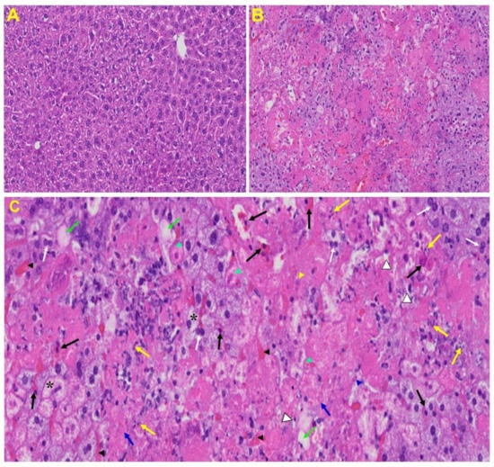 Liver from MHV-1 exposed mice. (A) Normal mouse. (B) Infected mouse liver at day 7. (C) The MHV-1 infected mouse liver at day 7 shows hepatocyte degeneration (yellow arrows), severe periportal hepatocellular necrosis with pyknotic nuclei (black arrows), severe hepatic congestion (black arrowheads), ballooned hepatocytes (asterisks), vacuolation (green arrows), and the presence of piecemeal necrosis (blue arrowhead), as well as hemorrhagic changes. Ground glass hepatocytes show voluminous, abundant, granular cytoplasm, peripheral cytoplasmic clearing and central nuclei, and apoptotic (acidophil) bodies. Several hepatocytes are absent and have been replaced by abundant inflammatory cells (yellow arrowhead). Note the condensation and dark staining of the cytoplasm and the absence of the nucleus (green arrowheads), fatty changes (blue arrows), binucleated hepatocytes (white arrows), and activated Kupffer cells (white arrowheads), indistinctive of severe liver failure (H&E original magnification of A&B is 400× as noted in Figure 5B).