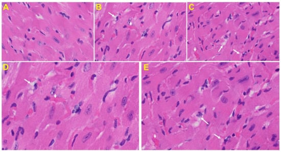 Nearly one-fourth of those hospitalized with COVID-19 are diagnosed with cardiovascular complications, which have been shown to contribute to approximately 40% of all COVID-19-related deaths. A recent study used cardiac MRIs on 100 individuals who had recovered from COVID-19 within the past 2 to 3 months, finding abnormalities in the heart of 78% of recovered patients and “ongoing myocardial inflammation” in 60% []. The same study found high levels of the blood enzyme troponin, an indicator of heart damage, in 76% of patients tested, even though heart function appeared to be generally preserved. Furthermore, current evidence demonstrates myocardial inflammation with or without direct cardiomyocyte damage in humans with SARS-CoV-2 infection [,,,,,,,]. Myocarditis results from direct heart invasion by the virus itself or more commonly by inflammation caused by cytokine storm, resulting in an enlarged and weakened heart, leading to low blood pressure and fluid deposition in the lungs. Histopathological evidence suggests the presence of hypertrophied cardiomyocytes along with inflammatory infiltrates, focal edema, interstitial hyperplasia, fibrosis, degeneration, necrosis and signs of lymphocytic myocarditis, the presence of CD4 T-cells along with other inflammatory infiltrates in myocardium, endocarditis and inflammation of interstitial tissue, damaged cell membrane interstitial cells, and leukocyte infiltration in humans with SARS-CoV-2 infection [,,,,,,,,,]. We also identified many events in MHV-1 infected mouse hearts that have been observed in humans with SARS-CoV-2 infection. These include severe interstitial edema, vascular congestion and dilation, and red blood cells infiltrating between degenerative myocardial fibers.