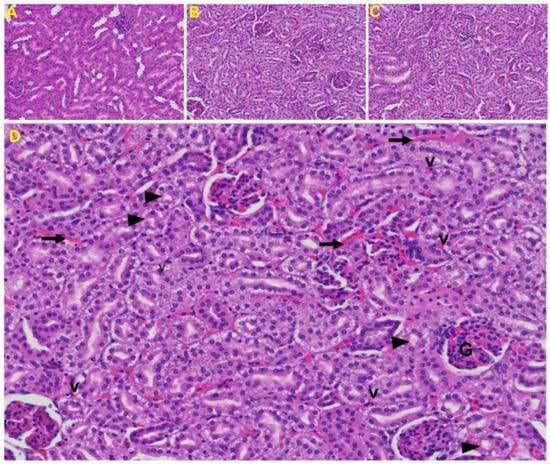 Kidney from an MHV-1 infected mouse. (A) Normal mouse kidney. (B,C) Kidney sections from an MHV-1 infected mouse. Kidney sections from a control mouse showing a normal histological structure with the glomerulus, proximal convoluted tubule, and distal convoluted tubules. (D) Enlarged image of a kidney from an MHV-1 infected mouse showing proximal and distal tubular necrosis (arrowhead), hemorrhage in the interstitial tissue (long arrow), and vacuolation of renal tubules (V) (H&E original magnification of A–C is 400× as noted in Figure 5B).